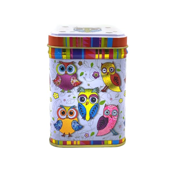 Es una práctica y decorativa lata de metal con capacidad para 25 gramos de té o infusión. Está decorada con un alegre y colorido dibujo de búhos con brillo metalizado. Cuenta con una tapa con cierre a presión que garantiza que el contenido queda perfectamente aislado del aire y la luz. Permite mantener los tés o infusiones protegidos para que conserve sus cualidades de sabor y aroma durante más tiempo.