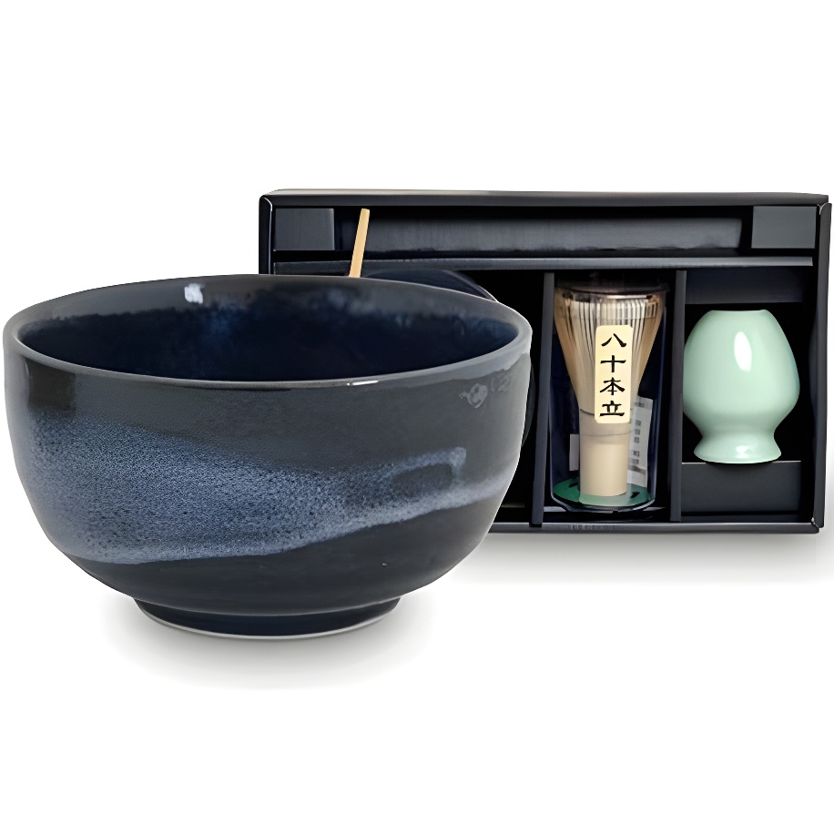 Set para matcha de cuenco de cerámica japonesa de 0,50 l. con cucharita, batidor y soporte, en caja de regalo. Hecho en Japón.