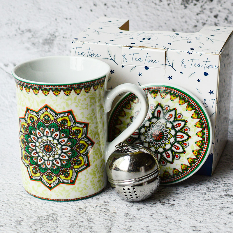 Bonita taza de Infusión de porcelana con dibujo de mandalas verdes. Apta para Lavavajillas y microondas. Con colador de infusión incluido. MEDIDAS 11X8,5X11cm