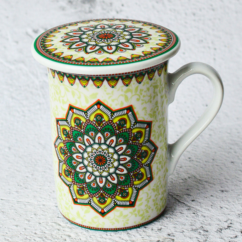 Bonita taza de Infusión de porcelana con dibujo de mándalas verdes.
