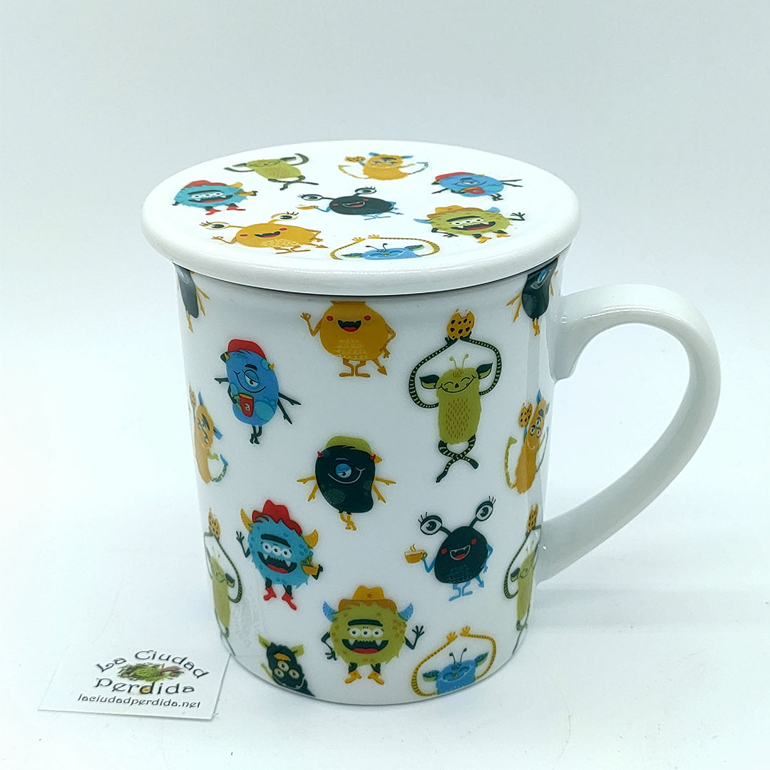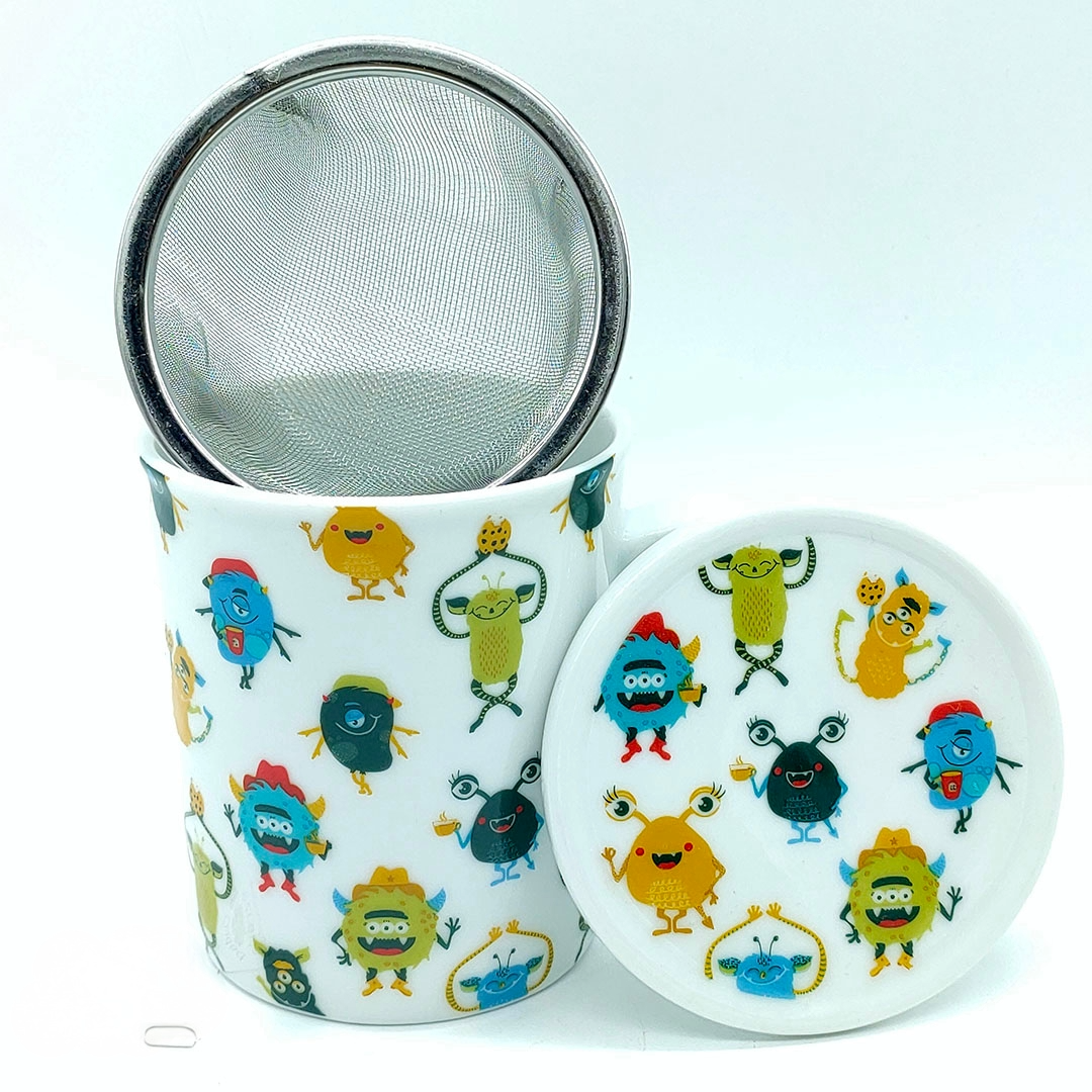 Taza Monsters 250ml con tapa, de porcelana con infusor de acero inoxidable.